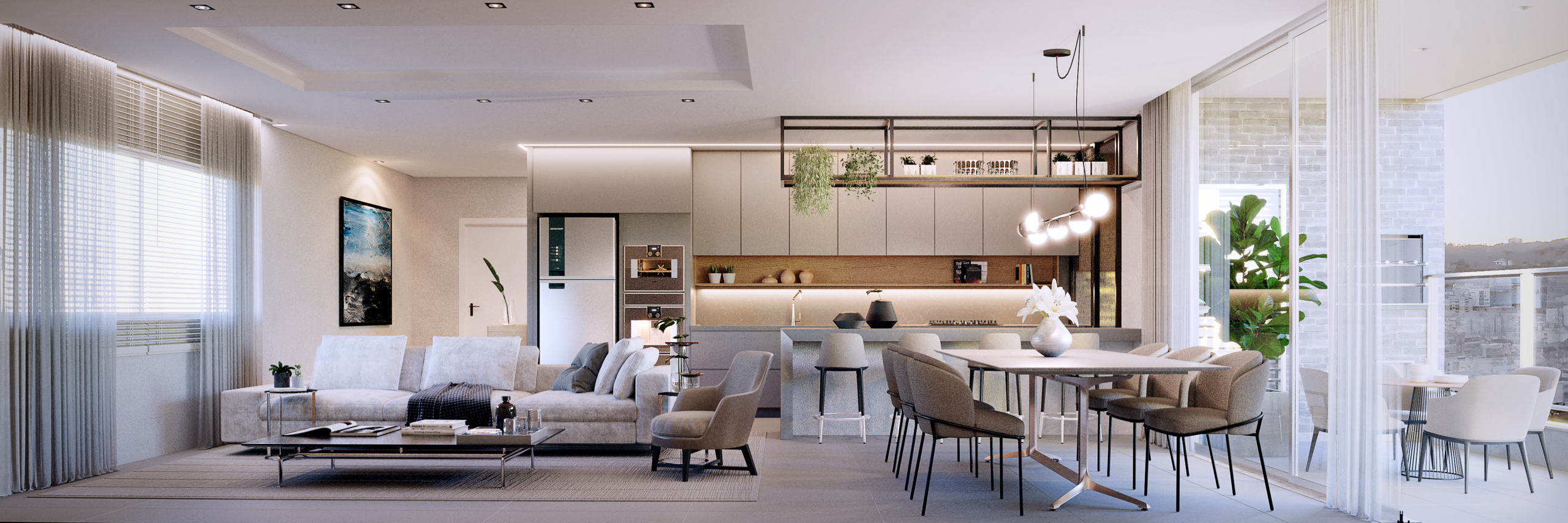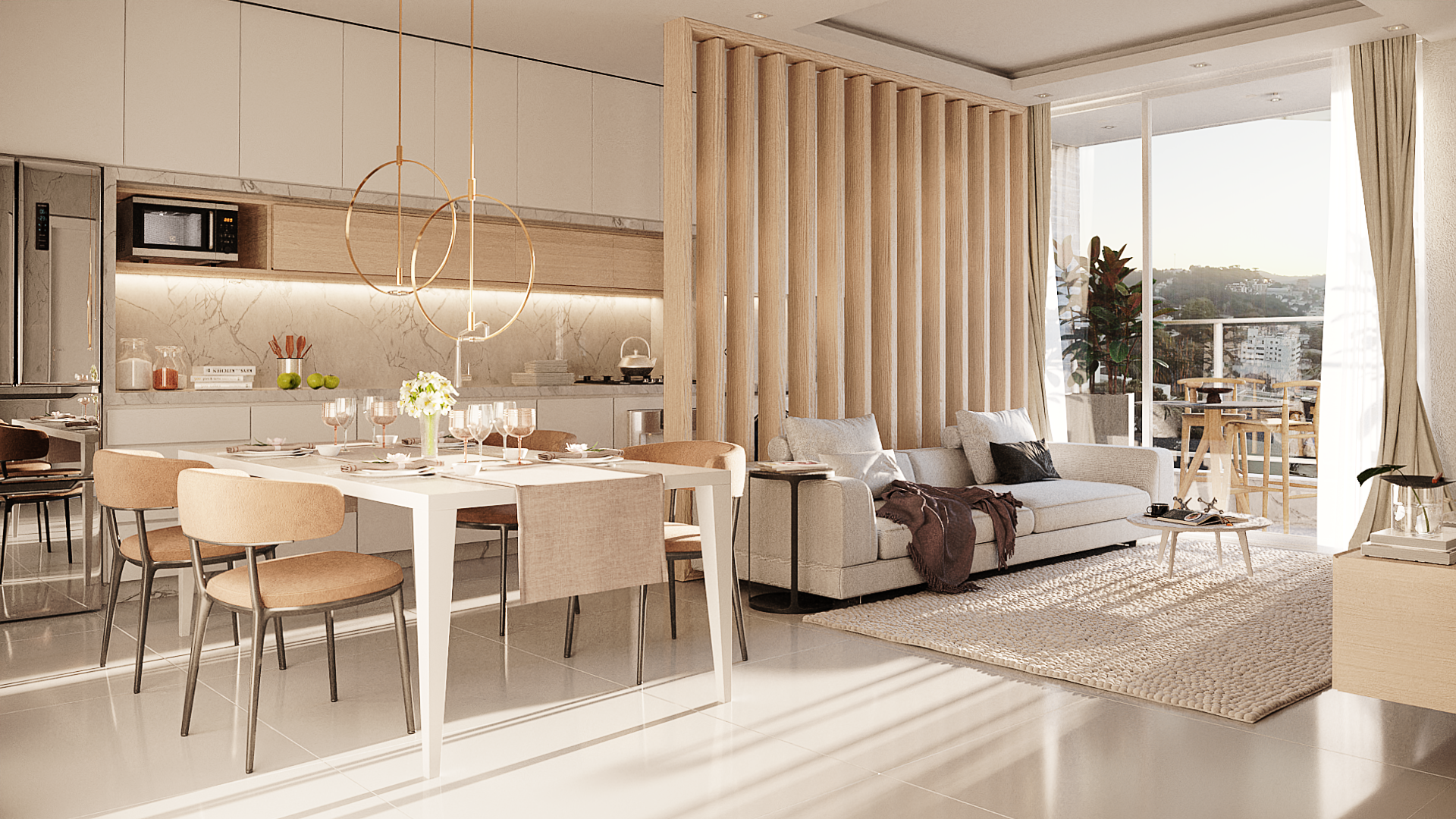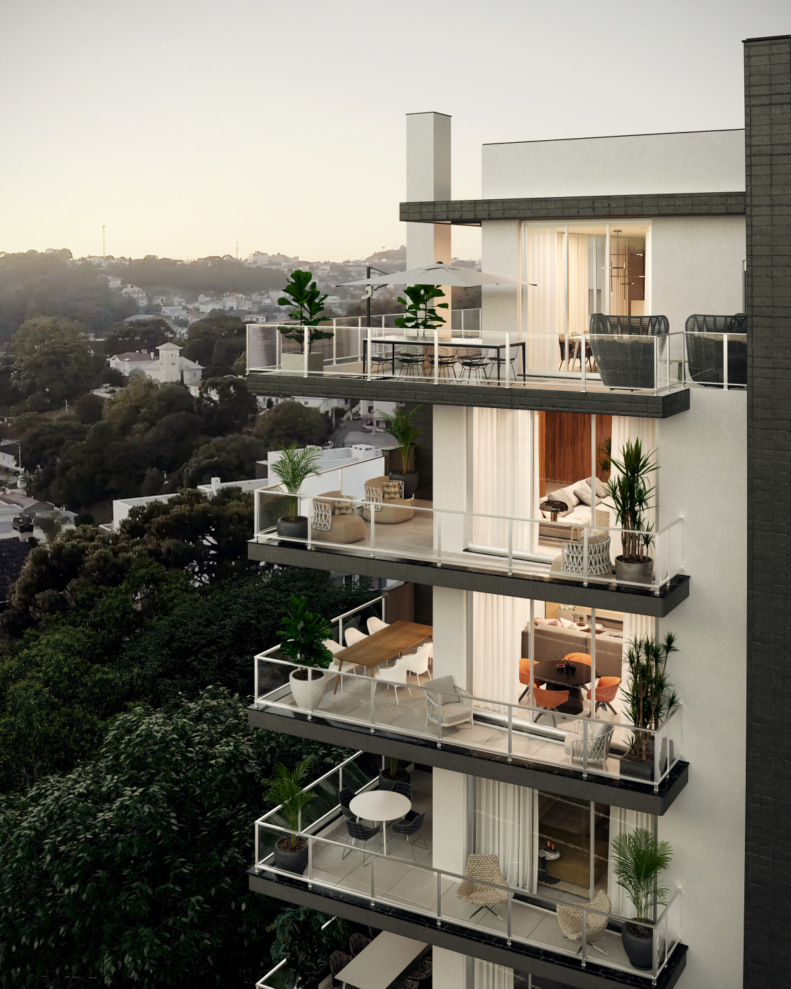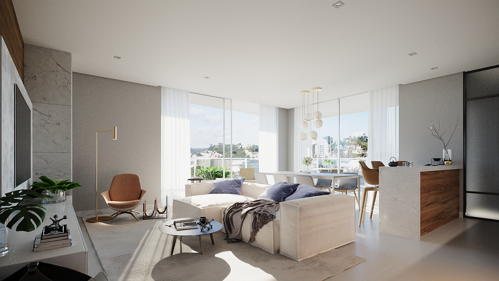 As esquadrias em PVC garantem uma ótima iluminação natural e isolamento térmico e acústico, proporcionando um ambiente aconchegante em todas as estações do ano. Além disso, a vista panorâmica da sacada aberta é um convite para relaxar e apreciar a paisagem da cidade.
